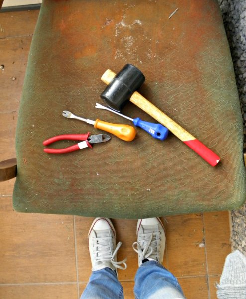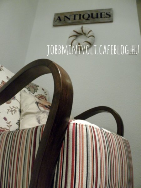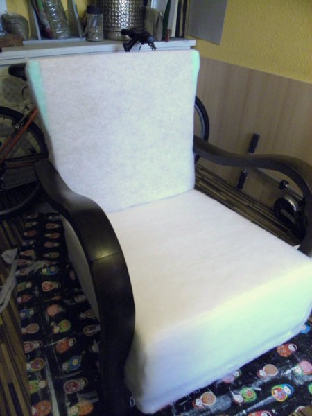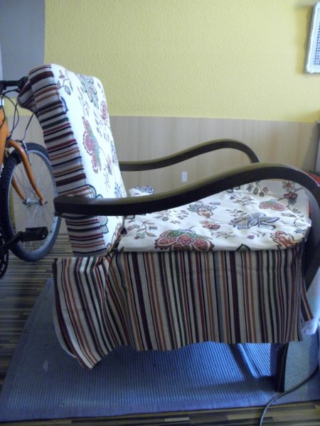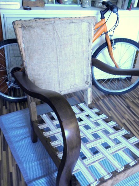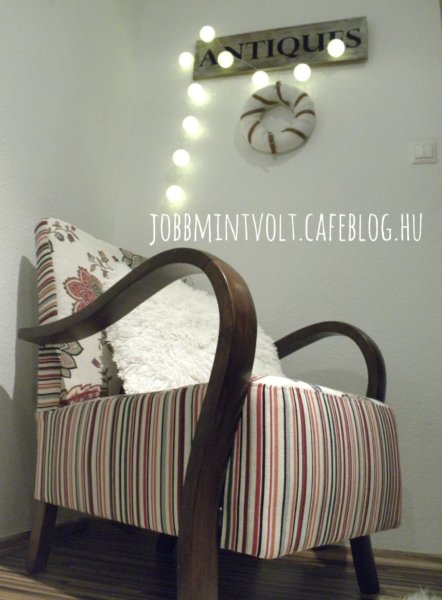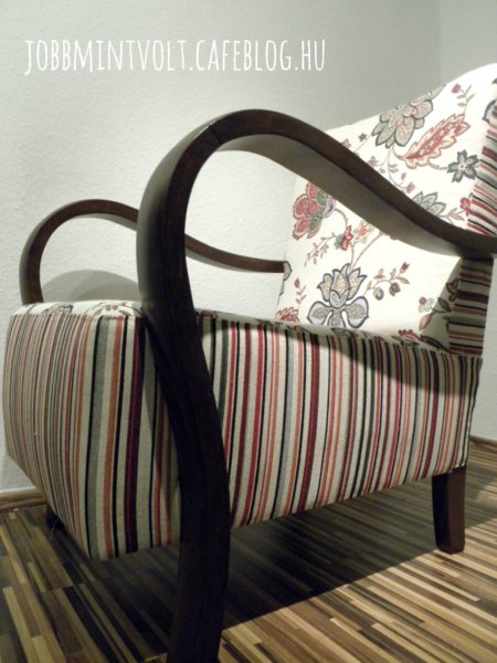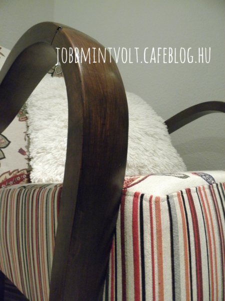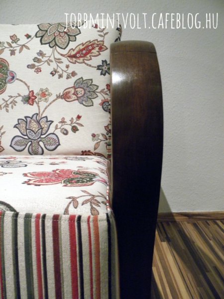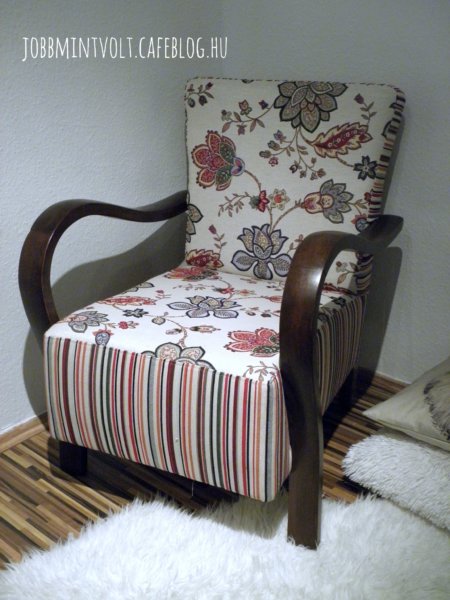 A meleg szobába csak akkor került, amikor már csak faváz volt belőle. Némi csiszolgatás, újrafestés a farészeken, majd kezdődött a kárpitozás. Nem is tudom mikor kárpitoztam utoljára. A suliban szoktunk, meg a workshopokon is csinálgatom, de így a műhely magányában, itthon már régen készítettem bármit is. Ez persze azért is, mert kevés az időm, nem vállalok el semmit. Ez a fotel is kb fél évet várt, mire hozzám került. Magamnak meg ugyebár már mindent áthúztam, szóval régen kapcsoztam. Azért elárulom, hogy készülök a kanapét újra átkárpitozni, de még csak a tervezgetés fázisban van.