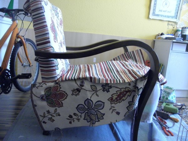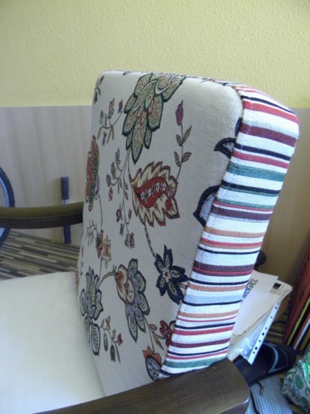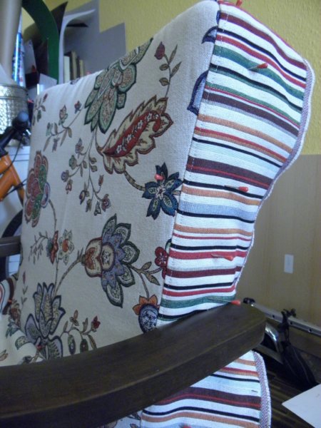 Virágos és csíkos anyag lett kiválasztva hozzá, a támla egyértelmű volt, hogy oldalt lesz csíkos, így azt kiszabtam, összegombostűztem, felpróbáltam. Mivel a rusnya eredeti kárpitot egy pillanattal sem akartam tovább megtartani, mint muszáj, ezért azzal az ívvel került a kukába, ahogy leszedtem. De így nem volt szabásmintám, ezért volt a gombostűzés és próba. Egyébként már el szoktam ezt hagyni, és rögtön varrom össze a gondosan kiszabott részeket, de ebben az esetben nem akartam elszúrni az íveket.