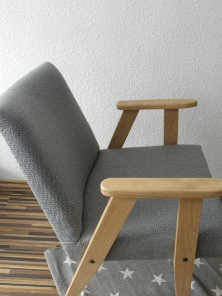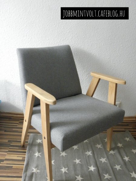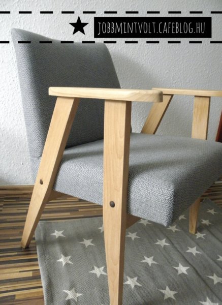 Dia is hamar beleszeretett, gyorsan talált is olyan szövetet rá, ami illik a fotelhez, hozzá és a lakásuk enteriőrjét sem üti. Én odáig vagyok a retro cuccokért, a 60-70 évek tömeggyártásban készült máig megmaradt formákért, darabokért, úgyhogy -titkon bevallom- nagyon örültem a felkérésének, hogy újra ilyet kárpitozhatok. Már készült pont ilyen fotel nálam, itt találtok arról leírást.