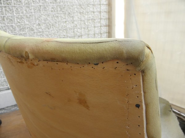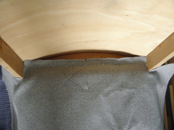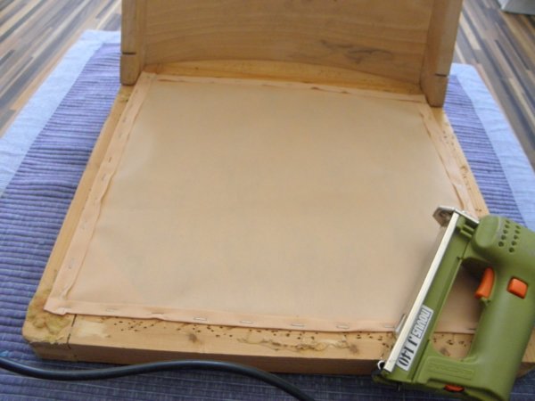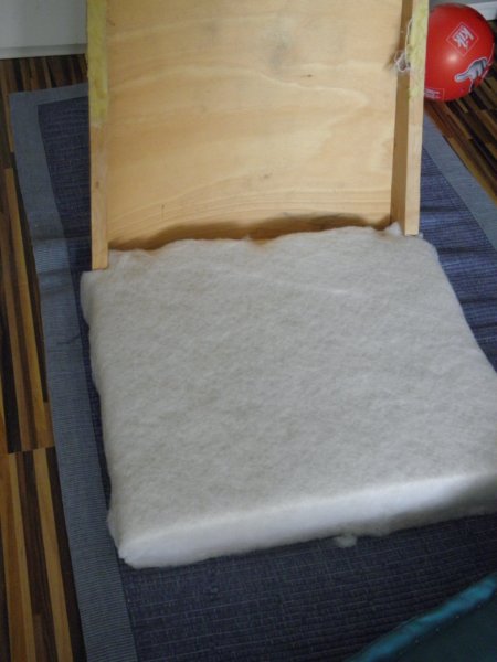 A kárpitozandó részen először az ülésre került fel a tartószerkezet és a szivacs, kárpit, majd a támla részt kellett felraknom. Ez kicsit kitekert ennél a típusnál, mivel a “kárpitosléc” (ami az anyagok rögzítéséhez szükséges szerkezeti elem) úgy van elhelyezve, hogy alatta nem lehet a támla bevonatát átgyömöszölni, tehát elsőként visszájáról kell a szövetet rögzíteni. Nem kedvencem az ilyen, mert nehéz korrigálni, ha elrontja az ember.