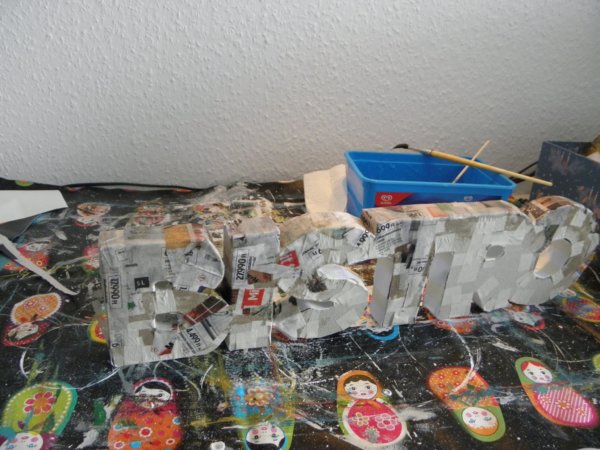 Kevés tapétaragasztót kevertem, és újságpapírcsíkokkal vontam be az egészet. Egész gyorsan ment, a tapétaragasztó meg csodás dolog, el is raktam bekeverve egy üvegben, persze nem tudom meddig jó így, de most minden papírdolgot ezzel fogok ragasztani 🙂 Van még mit tökéletesíteni a technikámon persze, de majd gyakorlom.