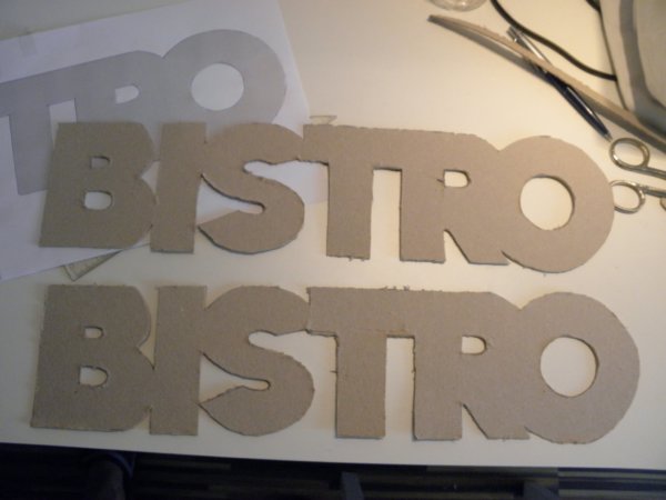 A kinyomtatott felirat alapján körbevágtam a papírlemezből kétszer a bistro-t. Mivel ez 3d felirat lesz, ezért kellett eleje és háta is.