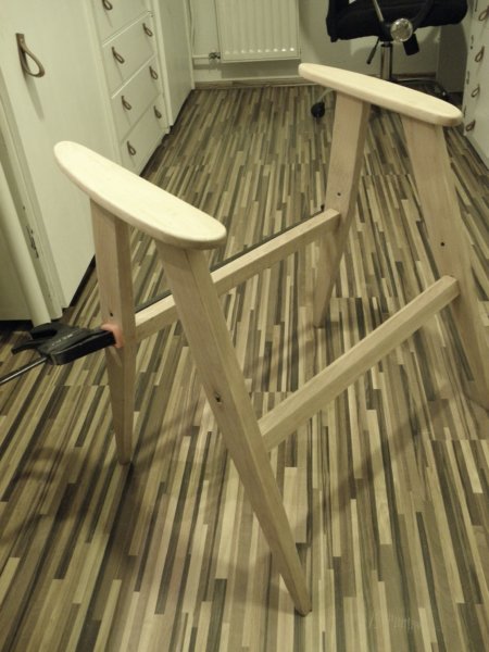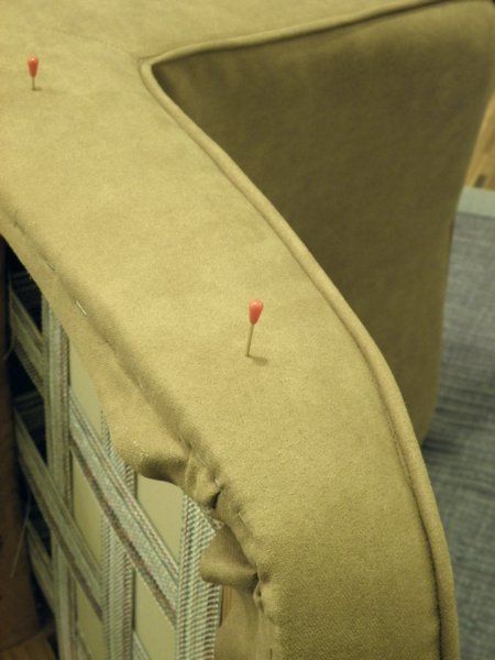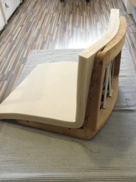 A támla/ülés találkozásnál gombozni kell, mert egyébként semmi sem húzza be abba az ívbe. Én itt belepróbáltam a lecsiszolt keretbe, milyen lenne, ha így maradna. Nekem maradhatna, de Hajni sötétbarnán kérte a keretet.