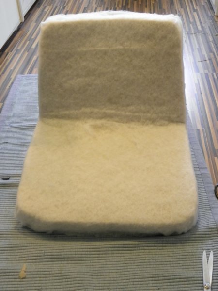 Erre jön a szivacs, ami itt 4 cm vastag. A váz formája nem téglalap, de a szivacsot a legszélesebb pontok alapján téglalapra vágattam, majd a vázra történő felragasztás után vágtam formára. Így kikerülhető a méregetés, rajzolgatás, egyszerűen a szivacsvágó kést a keret mellett kell csak tolni.