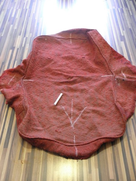 A régi kárpit a szabásminta, amin bejelöltem a főbb pontokat. Pl. a szálirányt, az összevarrások helyét, és a darabok illesztési pontjait is. Ezeket majd mind átmásolom az új anyagra is. Ezután már darabjaira szedhető, és mehet a szabás. Az én tippem: ahol varrásvonal van, ott milire pontosan szabni, ahol majd kapcsozással lesz rögzítve, ott lehet ráhagyni, mivel sosem tudhatod, hogy az előtted dolgozó mikor vágta kisebbre az anyagot.