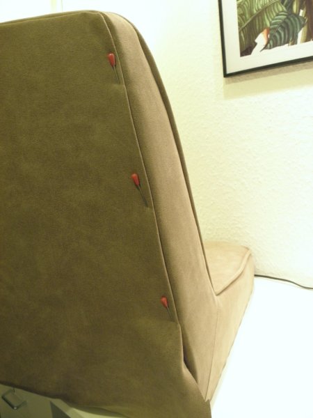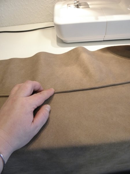 Az összevarrásnál egy másfajta bevarrt kéderezést csináltam, amihez nem varrtam előre kész kédercsíkot, hanem a “sál” (az oldalcsík) szélébe varrtam egy zsinórt, majd az ülés tetejéhez varrtam. Így ugyan van egy látható varrásvonal, kell is szép egyenesen varrni, de abból semmi nem látszik, mert a bevarrt zsinór rápöndörödik, és elfedi. Így is lehet, előnye, hogy a varrásnál nem kell 4 réteg anyagot összevarrni, mint ahogy előzőleg csináltam a kéderbevarrást.