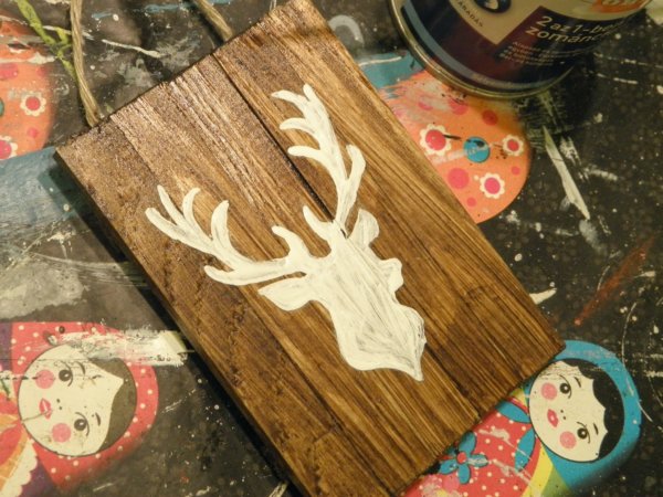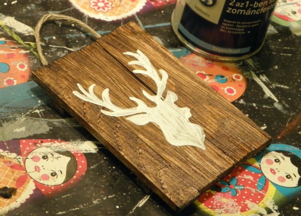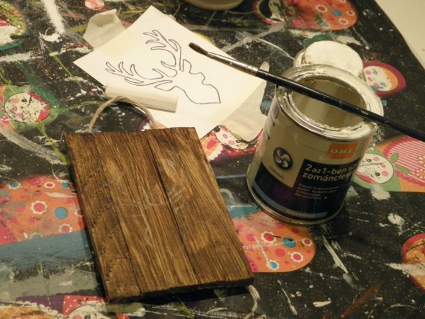 A táblákat összeragasztottam, majd lazúrral lekentem és a krétázós módszerrel felrajzoltam a mintákat, amiket zománcfestékkel festettem ki.