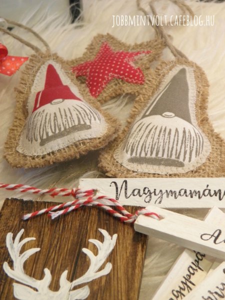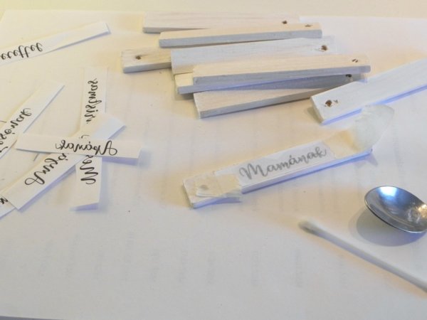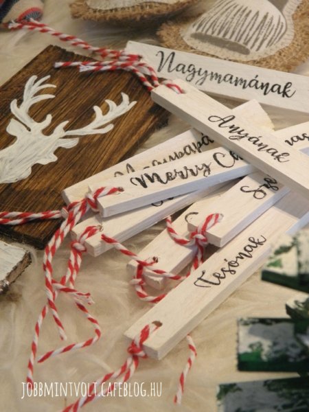 Az kifúrt ajándékkísérők fehér zománccal festettek, melyre a tükrözve kinyomtatott feliratot transzfer technikával vittem fel, majd madzaggal is elláttam.