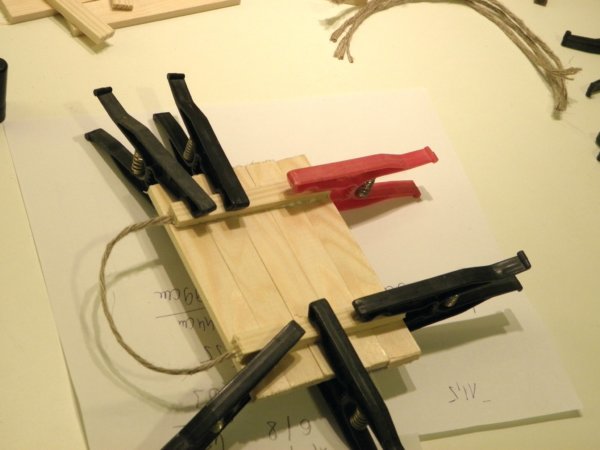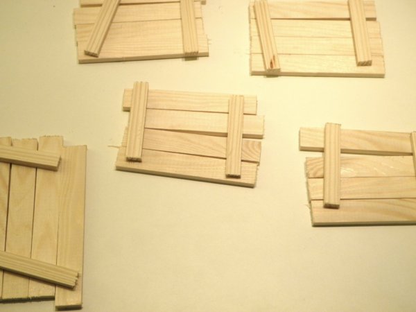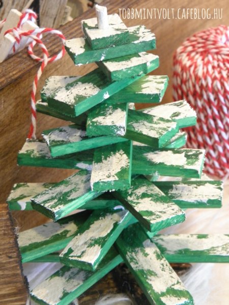 A fenyőhöz egy fapálcára (4mm átmérőjű) felfűztem a különböző méretű, középen kifúrt lécdarabokat. A felfűzésnél kevés ragasztót is nyomtam a furatba, hogy ne forogjanak el az ágak. Talpat is keresztbe rakott lécek alkotják.