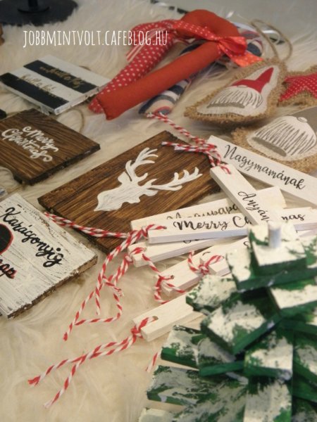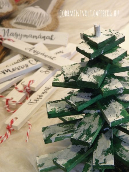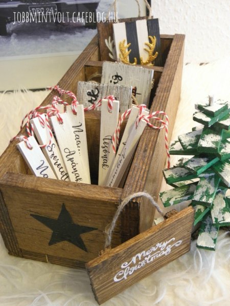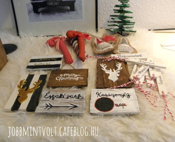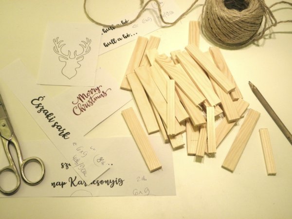 Lányom iskolájában ismét adventi vásár lesz, tavaly zsákvászonból alkottam rá, idén is a költséghatékony apróságok kerülnek eladásra. Mini fatáblák, mini fenyőfa és ajándékkísérők az idei árucikkek. Mindezt vékony lécekből. Mert rákaptam a lécek vagdosására és fúrására. Ehhez is csak ennyi kell: pár fenyőléc (5 x 15 mm, 2 méteres hosszban) nyomtatott minták és feliratok, festék. A léceket apró darabokra vágtam, a táblákhoz 9-11 cm, a fenyőhöz 12-3 cm közötti darabok, az ajándékkísérők 10 cm hosszúak.
