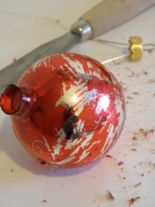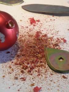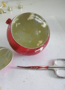 Elsőként simává tettem a felületet, lekapargatva a dombormintákat. Az asztalom úgy nézett ki, mintha Csingiling …. volna oda 🙂 Egyik gömb behorpadt, de ennek kivágtam körömollóval egy részét, végül ez lett az egyik kedvencem.