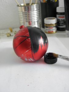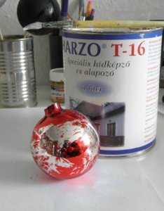 A letisztázott díszeket ablaktisztítóval áttöröltem, és elővettem mindenféle festéket, ami épp eszembe jutott. Táblafesték, zománc, akril és előkerült alapozásnak Harzo barátom is. Amint nem festettem feketére, azt mind lealapoztam, hogy ne üssön át a piros alap.