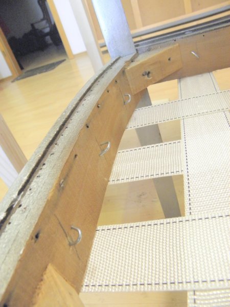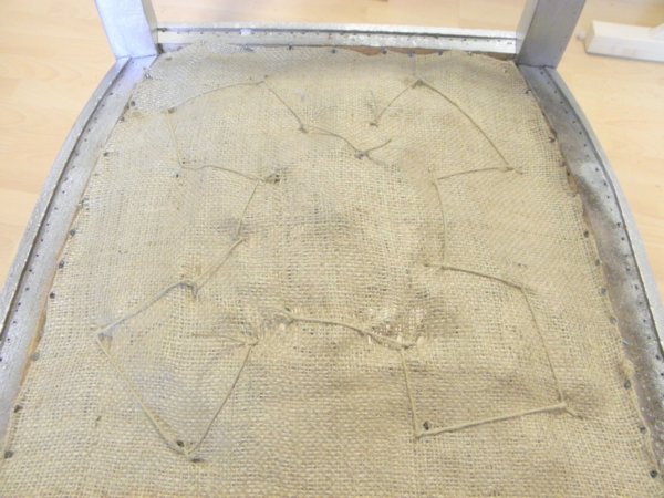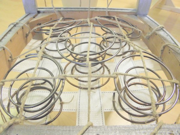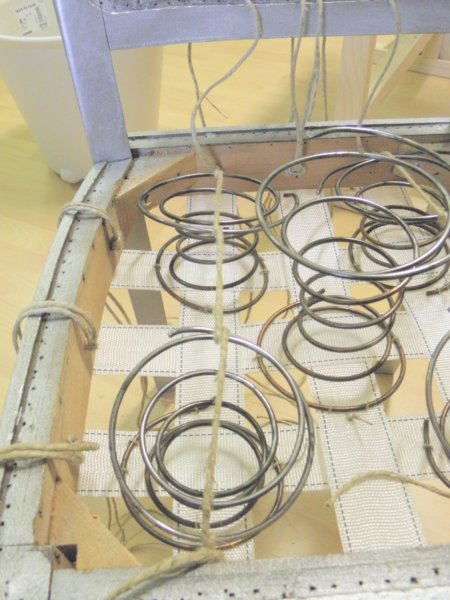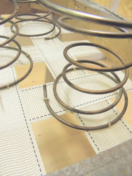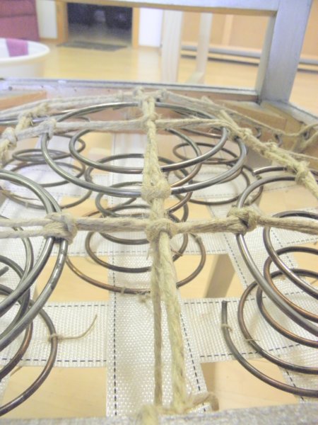 Erre a rugózatra kell rugóvászon, melyek kicsit lazán a tetejére szegezünk (visszahajtva és a keret belső élén szegelve).