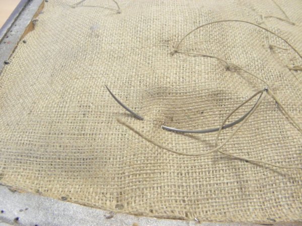 Most a rugók felső menetét varrjuk, ezúttal ehhez a vászonhoz. Görbetűvel (nagyobb fajta) egész könnyen közre lehet fogni a vászon alatt lévő rugóhuzalt. Itt már kell egy áthurkolást végezni, hogy a varrásunk biztosan tartson.
