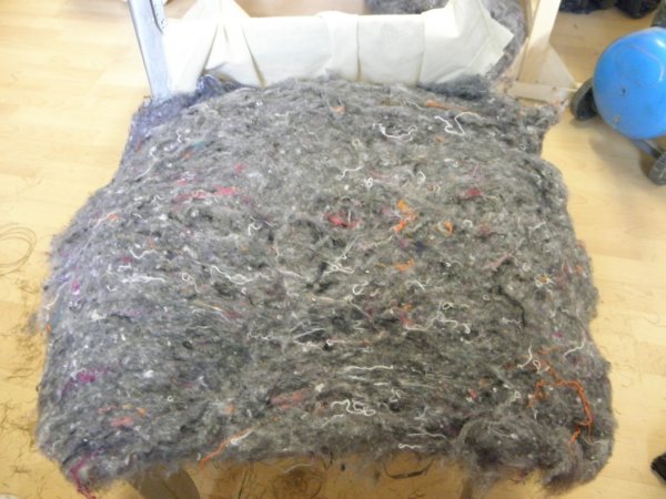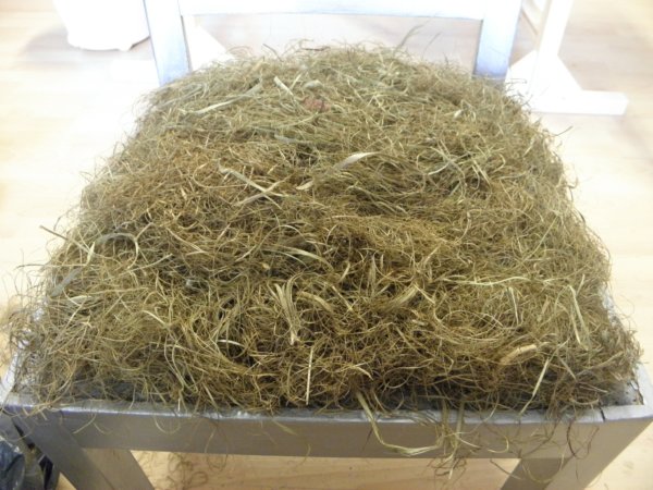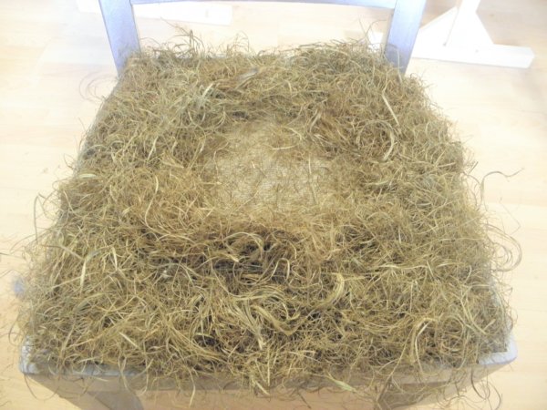 Az anyagtartó öltések alá betömködjük bentről kifelé, a széleken haladva az afrikot, majd az ülés közepét is feltöltjük. Az így készült “fészek” kb 5 cm vastag, egyenletesen felrakott afrik. Ujjal kell eligazgatni, kb úgy, mintha 2 kézzel és 10 ujjunkkal masszíroznánk a fejünk búbját.
