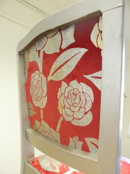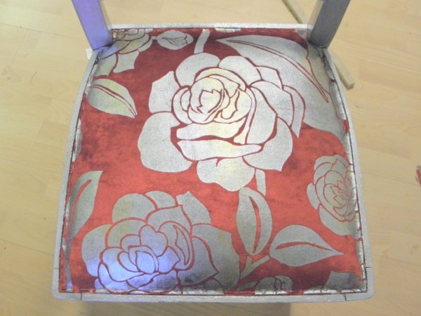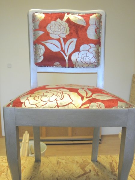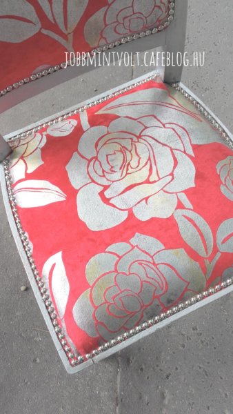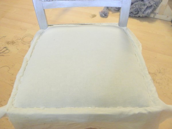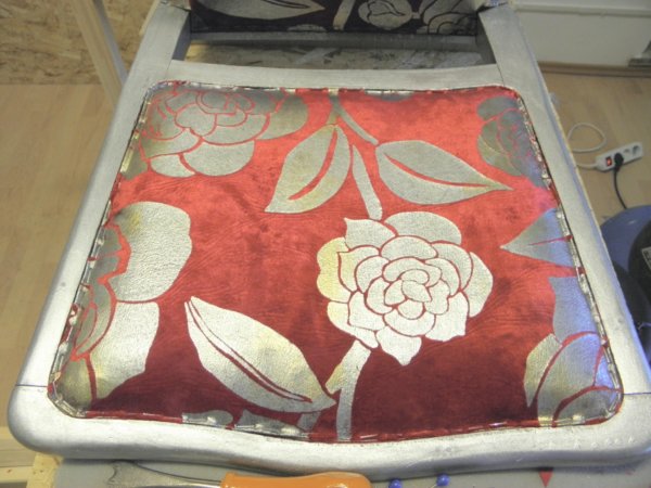 A támlához papírlemezt vágtam (ami pont belefér a keretbe) és kb 1 cm szűkebb szivacsot (2 cm vastag). A papírlemezre felragasztottam a támla külső oldalához az anyagot, és egyben betűztem a keretbe előlről. Itt is falcban kell dolgozni, ami nem túl széles, érdemes minnél beljebb dolgozni, a falc könnyen kiszakadhat a másik oldalon.