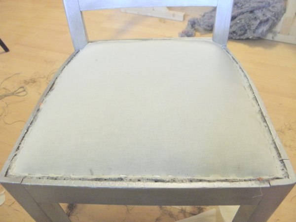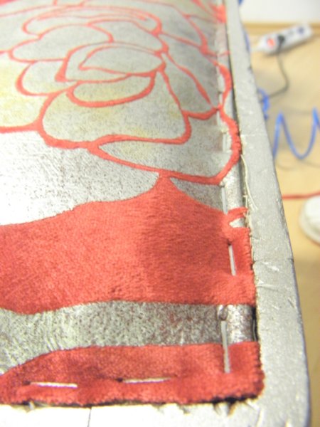 Ezt a sok mindent kell lelapítanunk kb 3 cm vastag, tömör párnázatnak az előzőleg felszegelt vászonnal, amit előre hajtunk és körben rögzítünk, de nem kell visszahajtva, csak simán. Előbb a sarkokat érdemes jól lehúzni, majd középről a szélek felé haladva előbb elől, majd az oldalakon. Ekkor már a falcba rögzítünk, de figyelni kell arra, hogy a tömőanyagok ne kandikáljanak ki a vászon alól, mindenütt egyenletesen legyenek a széleken is, és a vásznunk se érjen ki teljesen a falc széléig (mert akkor meg az fog virítani a kárpit alól). Azért látványos szerintem mennyire össze kell tömöríteni ezzel a vászonnal az előző nagy kupacot.