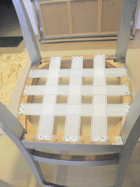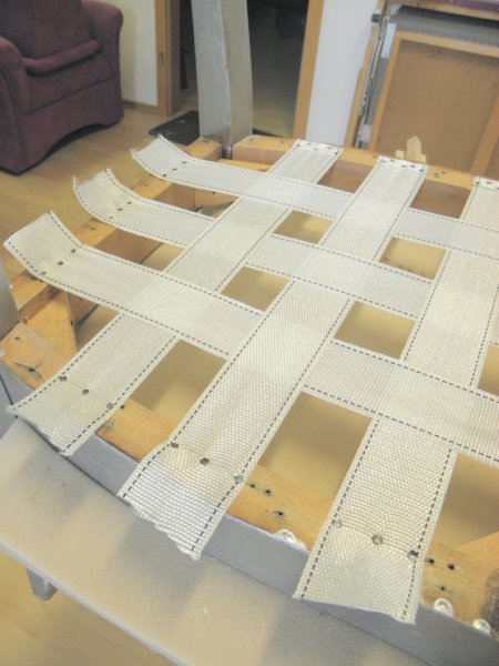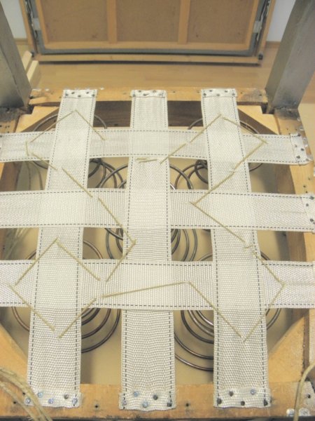 Ha megvannak a rugók, fel kell hevederezni a keretet. Minden rugó egy hevederkereszteződésen ücsörög, előre ezt is érdemes megtervezni, bár sokat segíthet az előzőleg lebontott hevederek helye, azt is lemásolhatjuk.