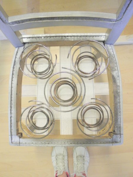 Először kiválasztjuk a rugókat, egy ilyen székhez 5 db kell. Valószínűleg ennyit is bontottunk ki belőle, simán felhasználhatóak újra, ha nem töröttek.