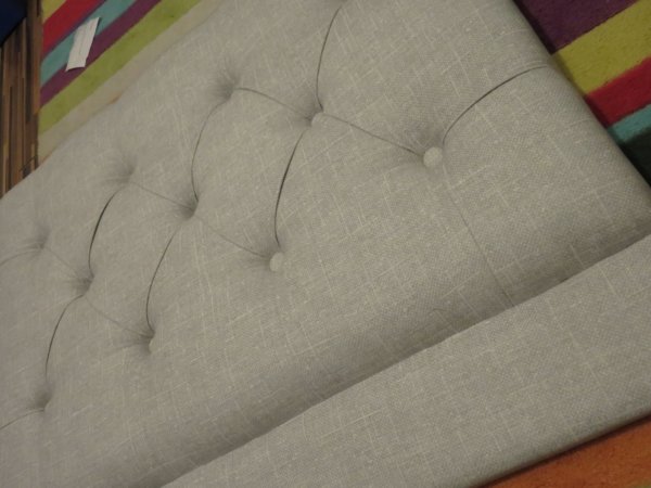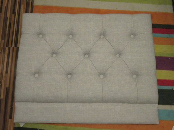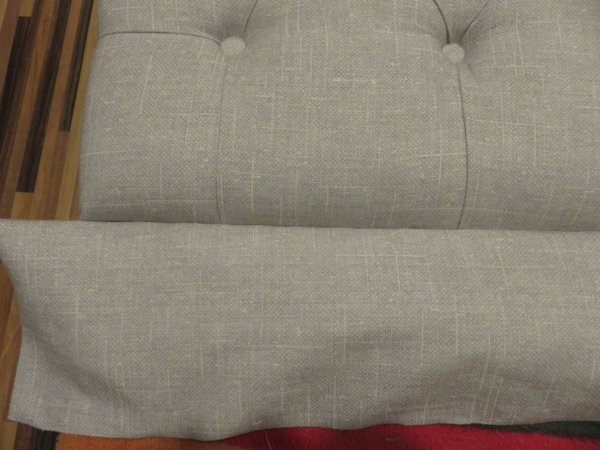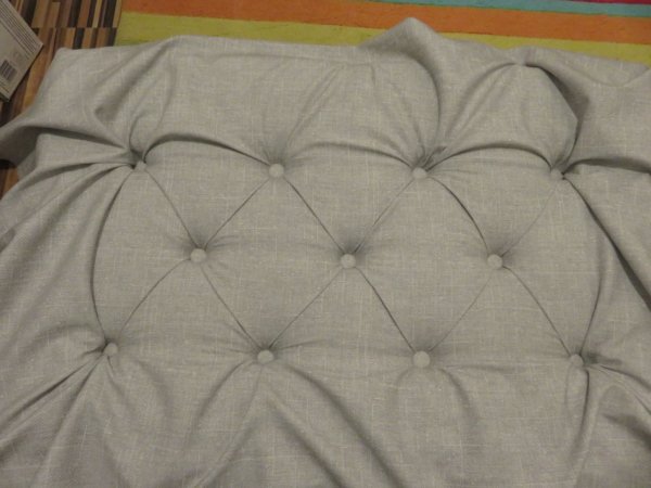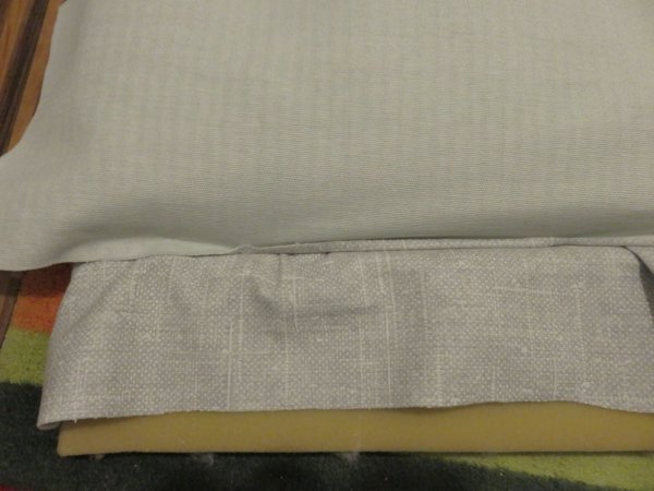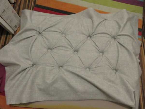 Az ágyvég alsó része bemegy az ágy mögé, itt nem kellett a szivacsozás, simán csak be kell fedni anyaggal. Ezt úgy oldottam meg, hogy visszájáról feltűztem egy anyagcsíkot (a hajtást megerősítettem egy papírcsíkkal, így határozottabb, egyenes vonalban hajtható le a textil….viszont elfelejtettem lefotózni). Ezt követően ráhajtottam a felületre és hátul rögzítettem.