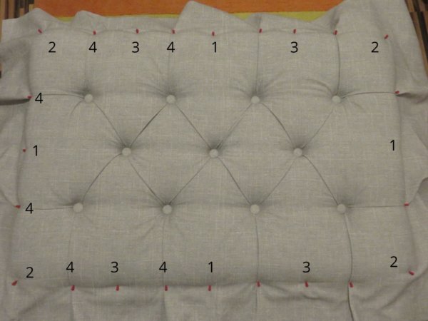 A gombokba duplán fűzött vastag cérna került, melyet egy nagy tűvel elölről tűztem fel sorban, a megjelölt helyeken. Először a középsőt, majd a felső sort és így tovább. Nem is kell túlvariálni, egyszerűen a kijelölt helyen felvarrni a gombokat. Ilyenkor ideiglenesen 1 db kapoccsal rögzítettem a hátoldalon minden cérnát, igyekezve már eléggé behúzni a gombokat.