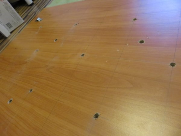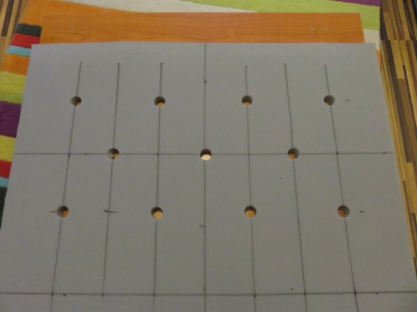 Lebontottam a régit, és újra terveztem a tűzések (gombok) helyét. Most a klasszikus kárómintát választottam, amit megszerkesztettem papíron, majd azt felrajzoltam az alapra és kifúrtam a gombok helyén.