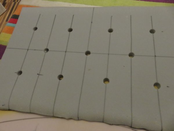 Felragasztottam, alul a szivacs oldalát lekerekítettem azzal, hogy ráfordítottam az alapra. Maradt a régi 1 cm szivacs, arra most rákerült a 3 cm + 2 cm vastag vlies is ment még rá. A lyukakat ott is elkészítettem.
