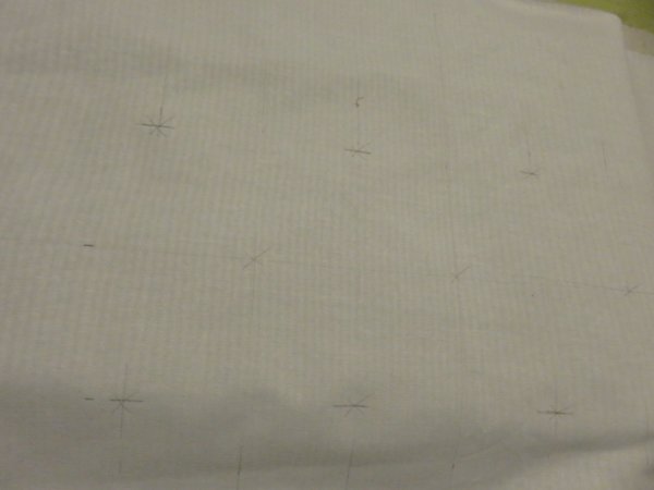 A tűzésmintát a textil hátoldalára is fel kell rajzolni, itt viszont ráhagyásokat kell tenni, ami azt jelenti, hogy a káróméreteket nagyítani kell, hogy a gombok által behúzott anyag megfelelően feküdjön majd fel (ráhagyás nélkül a gombokat nem lehet megfelelő mélységbe behúzni vagy túlságosan ellapítja a szivacsot, esetleg nagyon feszül az anyag). Én azt csinálom általában, hogy ami az előző rajzon ( még a lyukak tervezésén) 10 cm volt, az most 11 cm lesz, ami 13 cm volt az pedig 14 cm.