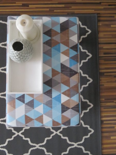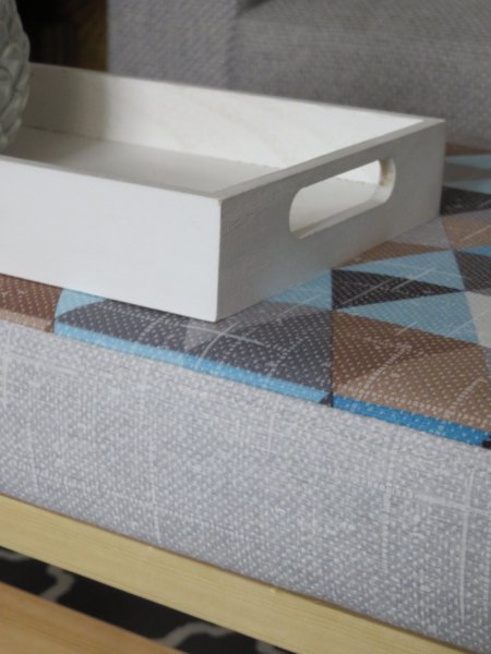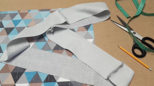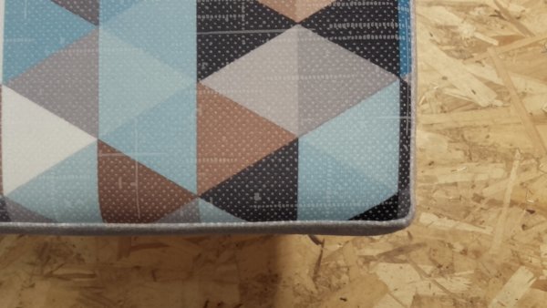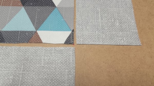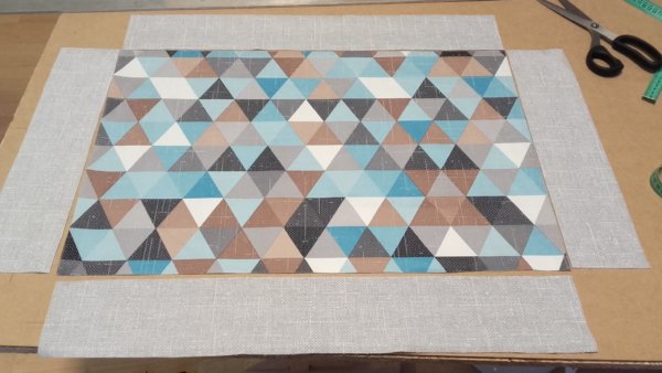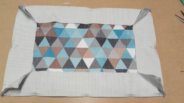 Szabás: a tetejéhez 40×60 cm anyagot vágtam (a bútorlap mérete + 1-1 cm varrásráhagyás), az oldalakhoz 2 db 40×9, illetve 2 db 60×9 cm (itt is a bútorlap oldalak a mérvadók + varrásráhagyások). Kiterítve így néz ki: