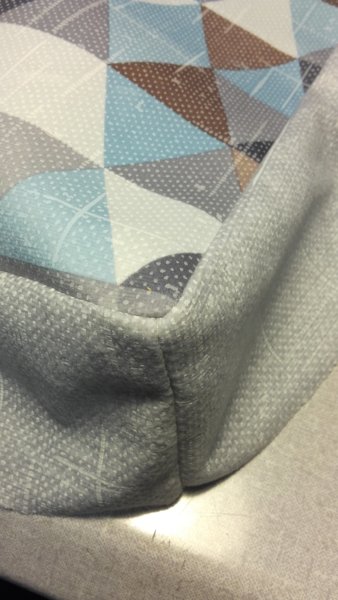 Varrás: először az oldalakat varrtam össze, egy körsál lett belőle. Aztán ezt körben felgombostűztem a fedlaphoz, sarkoknál anyagszél az anyagszélhez igazítva. Így az oldalcsík varrása pont a sarokba fut ki, és szögletes lesz. Én most szögletest akartam pont.
