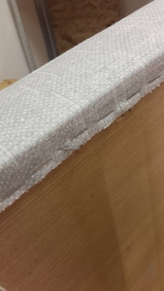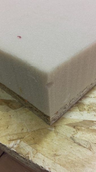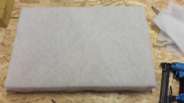 A kárpitozandó felület 38×58 cm bútorlap, amire 5 cm szivacsot ragasztottam, majd jó kárpitoshoz méltóan ezt bevontam vliessel. Ahogy kell.