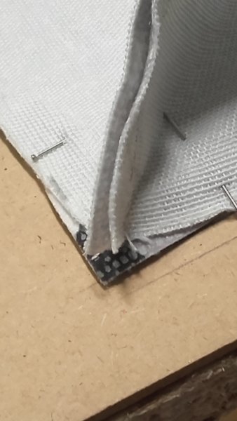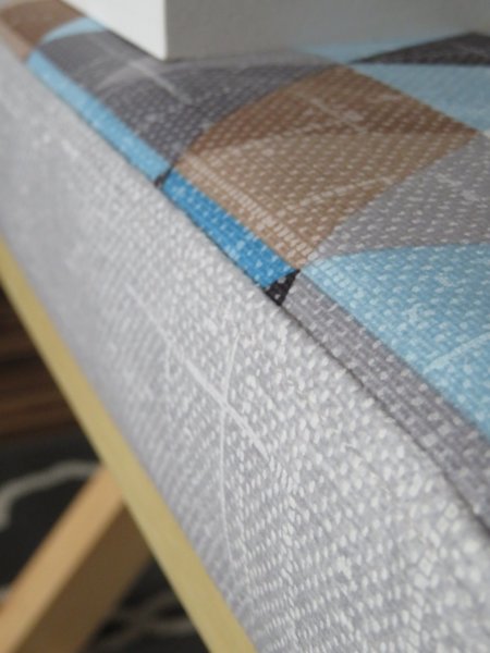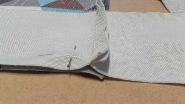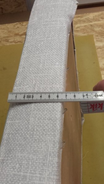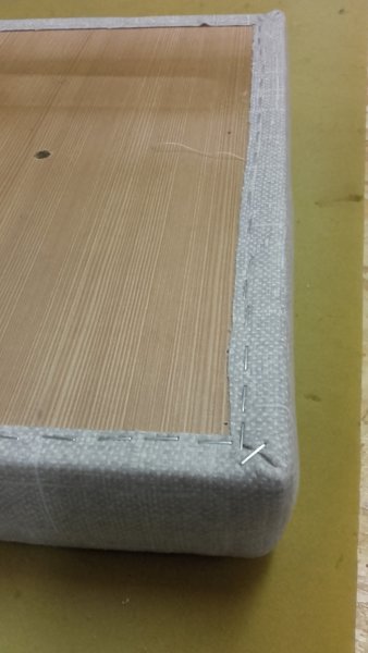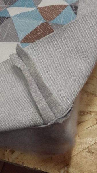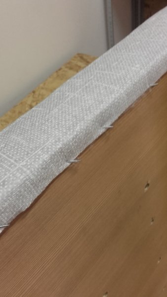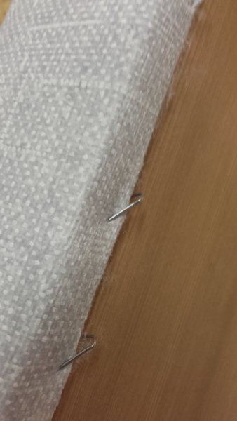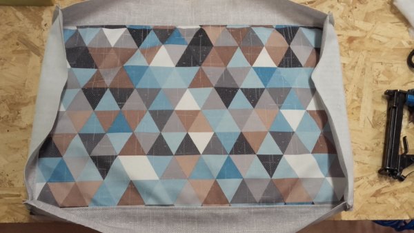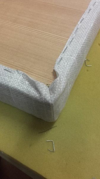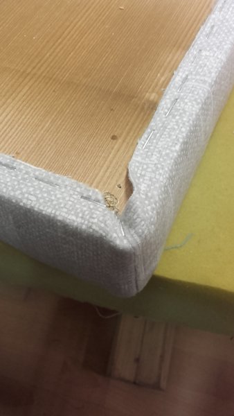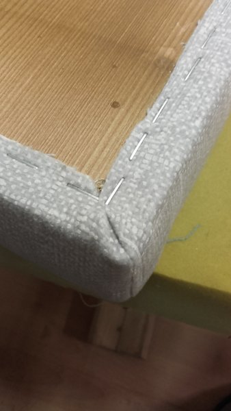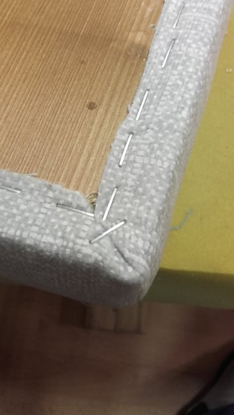 Kárpitozás: ezt a huzatot húztam rá a szivacsozott alapra, majd körben minden oldalon (sarkokat még nem) ideiglenesen felrögzítettem. Ez az ideiglenes rögzítés (un. kitűzés, heftelés) pont olyan, mintha nem sikerült volna alaposan kapcsozni, a kapcsoknak csak a fél lába fog, a másik a levegőben lóg. Így könnyen kiszedhető a véglegesítés folyamán. Az egyenletes magasságra törekedve minden rögzítésnél szoktam mérni is, hogy mennyire tartom a fix magasságot.