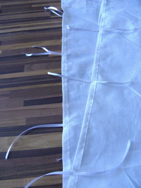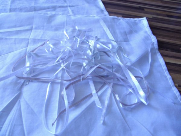 Egy vékony lepedővászonból kivágtam a megfelelő méretet. A szélessége a rugó menetek szélessége, a hossza pedig kedv szerinti, én 60 cm magasat csináltam. A kiszabott vásznat minden oldalán beszegtem, majd elővettem a szorgosan gyűjtögetett szalagokat. Ha új ruhát veszek, mindig kivágom belőle a vállába varrt szalagokat, és elrakom jó lesz majd valamire alapon. Na itt jött el a jó alkalom a felhasználásra. Persze, ha nem lett volna itthon, akkor veszek a rövidáruboltban…