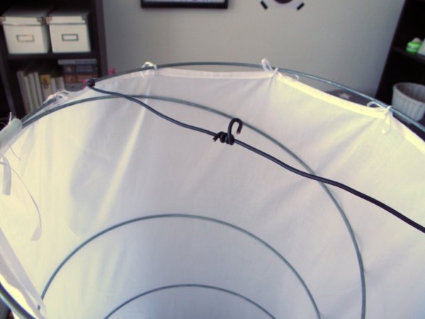 A tároló fémvázát kiszabadítottam a rávarrt anyagból, aminek az eredményeként lett egy jó nagy rugóm. Ahhoz,hogy ne izegjen, mozogjon, összekötözgettem, így kicsit formatartóbb lett.